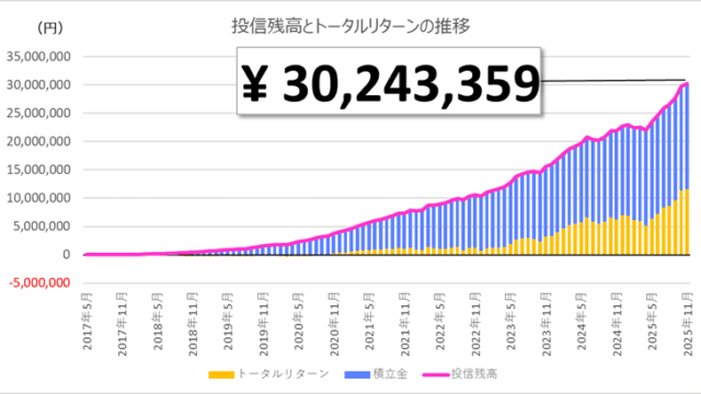 資産運用 【投資信託】31歳男の積立投資 103ヵ月目|残高 30,243,359円 こんにちは。たにしマン(@millionworkout)です。2025年11月の運用報告です。今月は48万円ほど増えました。投信残高は、3,024万円程度となっています!質問箱を設置したので、ご質問ください(; ・`д・´)「若いうちからコ... 2025.12.03 資産運用