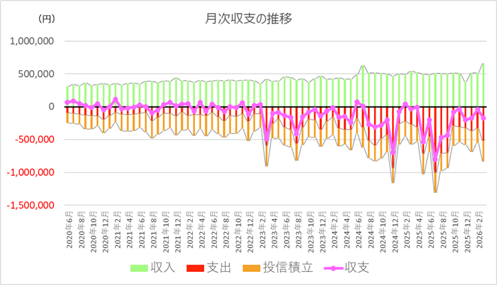 預金は今後のライフイベントで大きく切り崩されることが必至なので、初めから無きものと考えています。とはいえ、投信を切り崩すことは絶対に避けたいので毎月の収支をプラスにして預金残高も増やしておきたいところです。