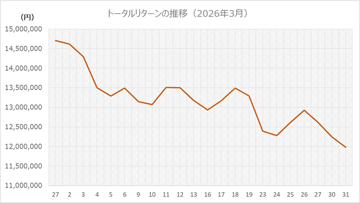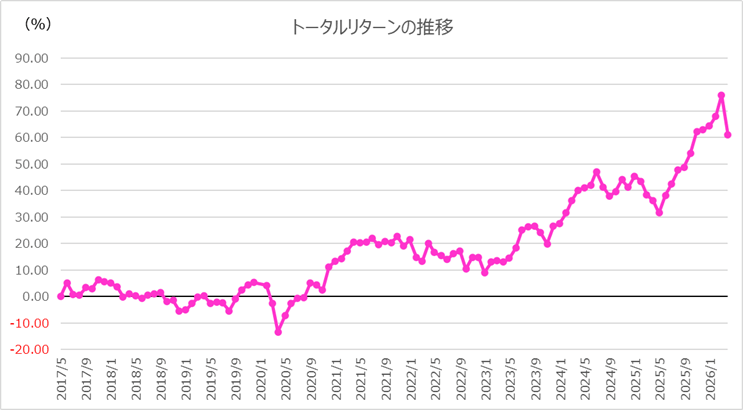 トータルリターンの推移を、金額ではなく比率で示しました。積立額の増加を考慮しない、純粋な運用成績です。投資信託でいうところの、基準価額に相当します。