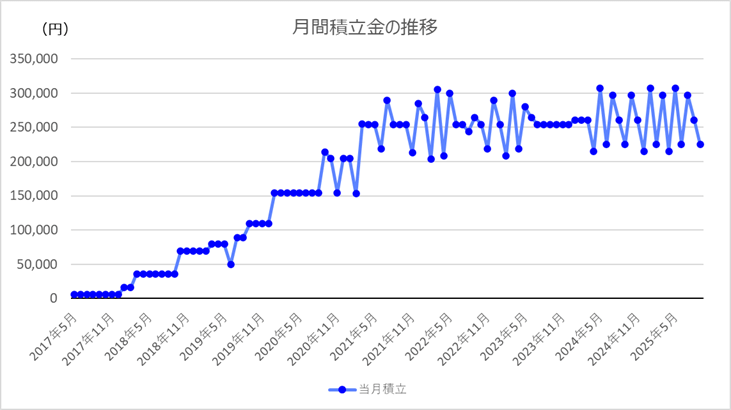 はじめの1年半くらいは会社のDC制度を使って、ひと月5000円を積み立てていましたが、「つみたてNISA」制度の開始をきっかけに徐々に積立額を増やしてきました。